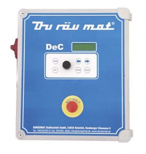 DeC-Safety rise aus dem Hause DURÄUMAT ist ein elektronischer Schaltautomat zur Steuerung von Seilzugentmistungen. Das System ist sowohl für zwei Einzel- als auch für einen Doppelantrieb geeignet und stellt eine Weiterentwicklung des erfolgreichen Vorgängermodells DeC dar. Es ist vor allem für den Einsatz von Räumschiebern, Unterflur-Schleppschaufeln, Warteraumschiebern und Spaltenreinigern vorgesehen. Die Anlage kann im Automatik- oder Handbetrieb bedient und vom Anwender mit bis zu 30 Startzeiten pro Tag programmiert werden.